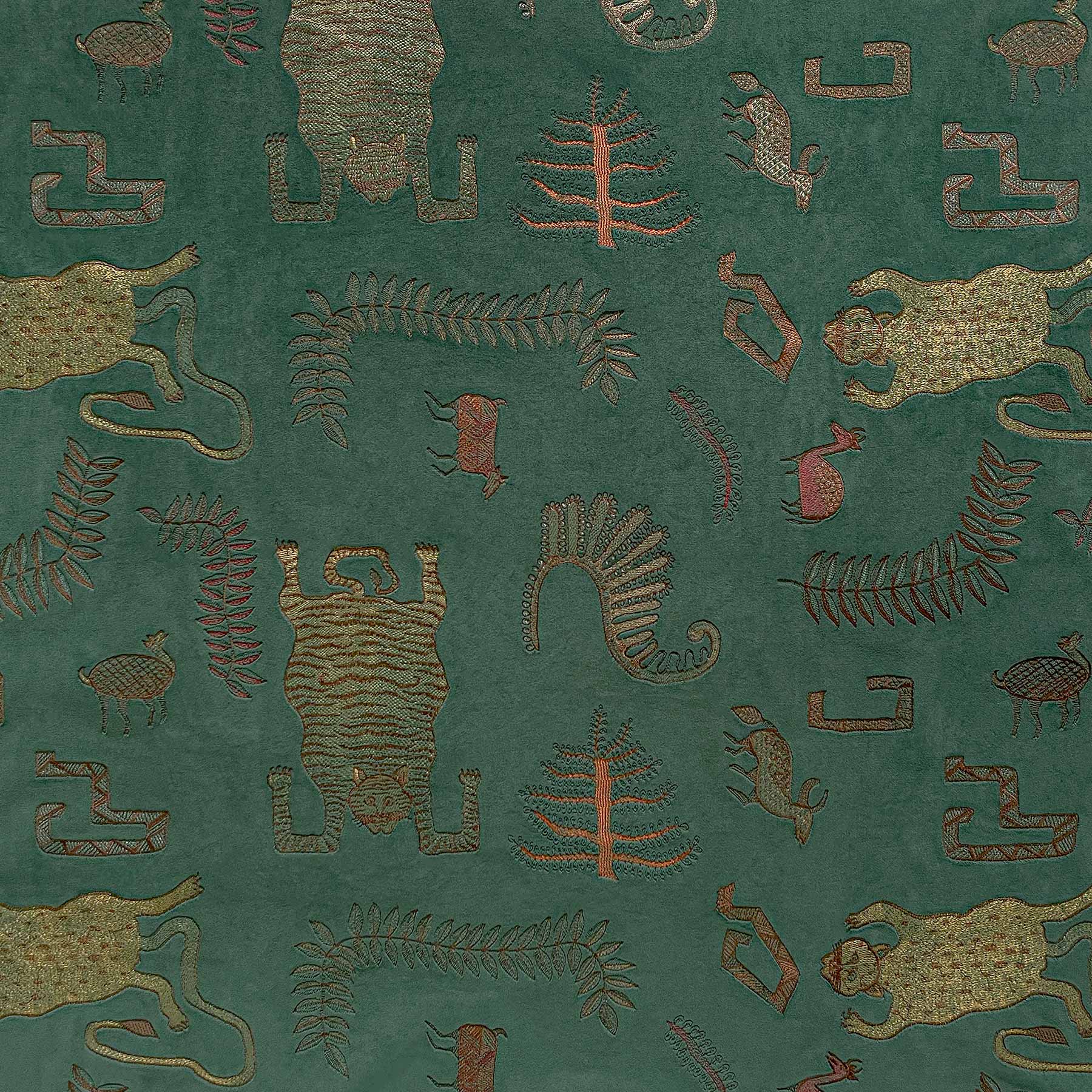 Masai es un terciopelo que deslumbra por su suavidad y magnetismo visual. Sobre su superficie se despliegan tigres majestuosos y símbolos tribales que parecen susurrar historias de culturas ancestrales. El contraste entre el brillo profundo del terciopelo y la riqueza del bordado crea una pieza de gran elegancia, con una caída fluida que viste el espacio con fuerza y distinción.